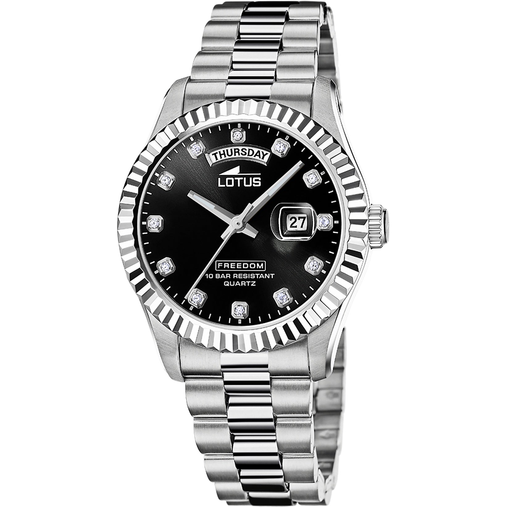 Die Lotus Freedom Collection 18854_7 Herrenarmbanduhr besticht durch ihr robustes Edelstahlgehäuse und das elegante schwarze Zifferblatt. Mit einem präzisen Quarz-Uhrwerk ausgestattet und geschützt durch Mineralglas, bietet sie eine Wasserdichtigkeit von 10 ATM – ideal für sportliche Aktivitäten und den täglichen Gebrauch. Das Edelstahlarmband mit Kippfaltschließe und Druckknopf garantiert sicheren Sitz und Komfort. Mit einem Durchmesser von 41,5 mm präsentiert sich diese Uhr als moderner Klassiker für Herren, die Wert auf Zuverlässigkeit und Stil legen.
