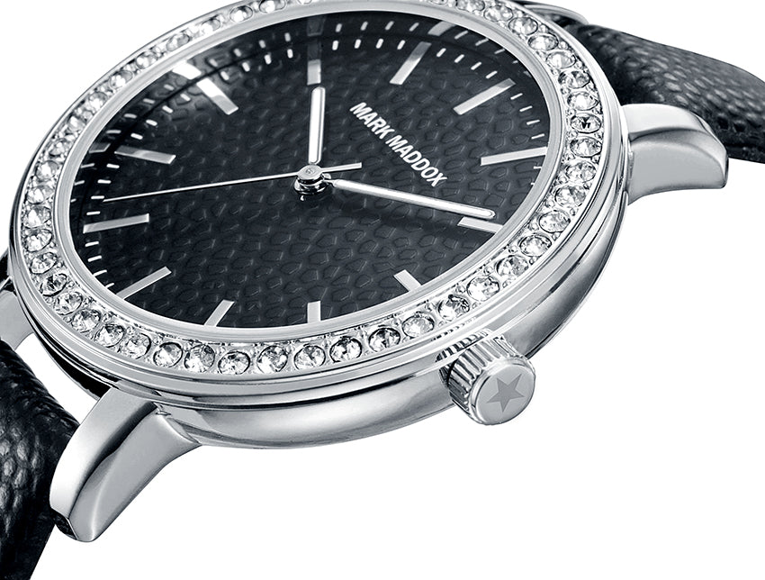 Die Mark Maddox Classic MC6009-57 ist eine elegante Damenuhr mit einem 36 mm Edelstahlgehäuse und mineralglasgeschütztem Zifferblatt in klassischem Schwarz. Das schwarze Lederarmband unterstreicht den zeitlosen Look optimal und macht sie zum perfekten Begleiter für den Büroalltag und stilbewusste Anlässe.