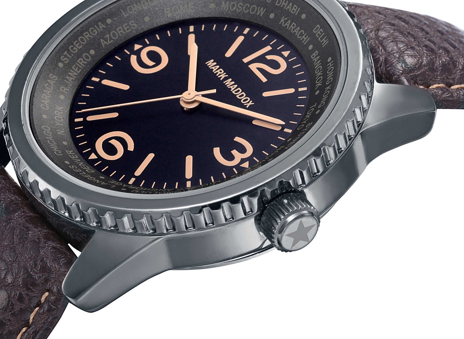 Mark Maddox HC6015-54 ist eine elegante Herrenuhr mit einem robusten Gehäuse aus massivem Metall in Schwarz und einem kontrastreichen schwarzen Zifferblatt mit arabischen Ziffern. Das braune Polyurethan-Armband mit Naht sorgt für einen sportlichen und zugleich modernen Look. Die analoge Quarzuhr besticht durch präzise 3-Zeiger-Technik und eine komfortable Schnallen-Schließe für sicheren Halt.