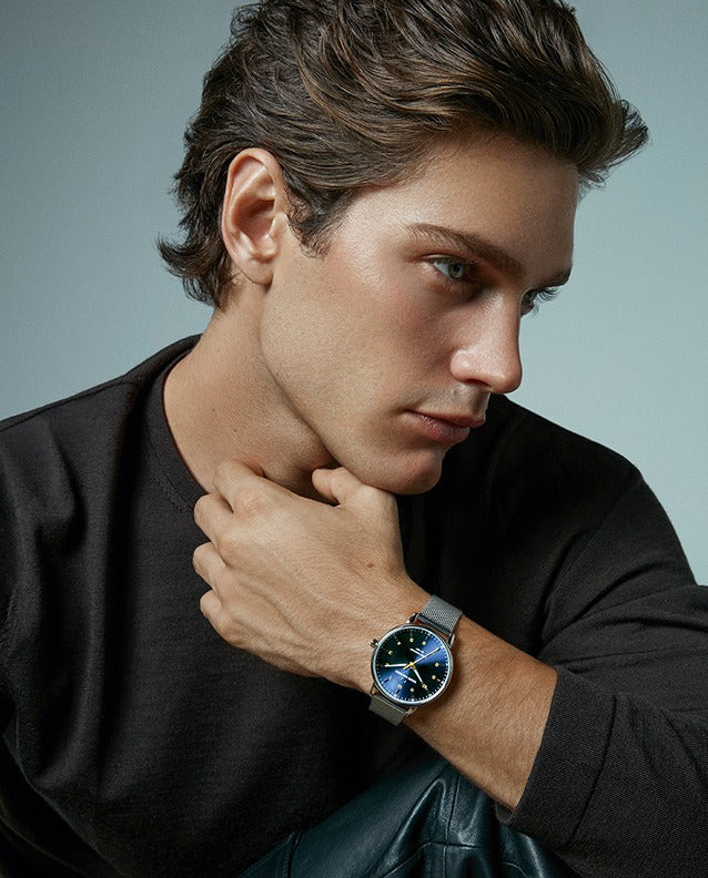 Diese moderne und elegante Herrenuhr besticht durch ein robustes Stahlgehäuse mit 40 mm Durchmesser und ein komfortables Milanaise-Stahlarmband in Silber. Das blaue Zifferblatt mit Indizes und arabischen Zahlen wird durch einen dynamischen gelben Sekundenzeiger ergänzt und wird von kratzfestem Mineralglas geschützt. Mit 5 ATM Wasserdichtigkeit ist sie perfekt für den aktiven Alltag und setzt stilvolle Akzente bei jedem Anlass.