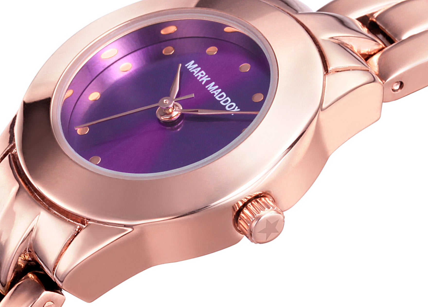 Elegante Damenuhr von Mark Maddox mit stylischem rosa IP-beschichtetem Metallgehäuse und passendem Armband. Das violette Sunray-Zifferblatt mit klaren Indizes sorgt für einen modernen Look, während das analoge Quarzwerk präzise Zeitmessung garantiert. Perfekt für modebewusste Frauen, die eine feminine und zugleich zeitgemäße Armbanduhr suchen.