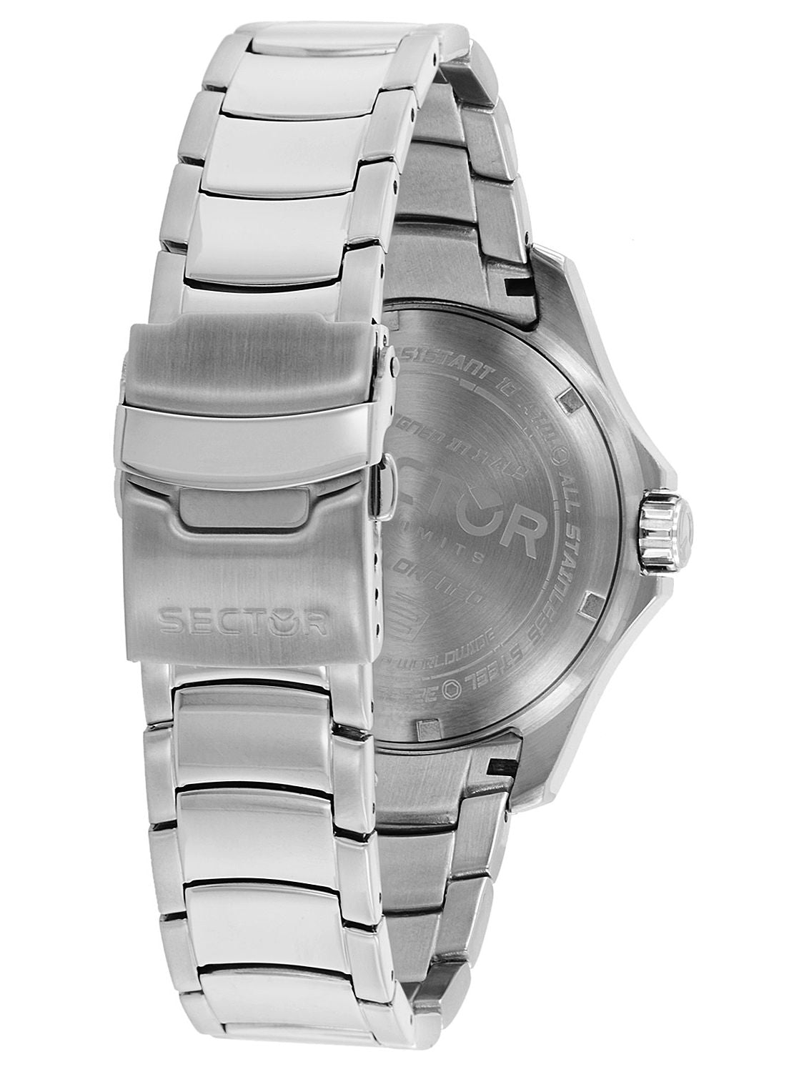 Sportliche Herrenuhr SECTOR No Limits S-99 R3253577002 mit robustem Edelstahlgehäuse und Aluminium-Lünette, versehen mit kratzfestem Mineralglas. Die Uhr bietet eine Wasserdichtigkeit bis 10 ATM (100 Meter) und verfügt über ein präzises Quarzwerk sowie Tachymeterfunktion für sportliche Einsätze.